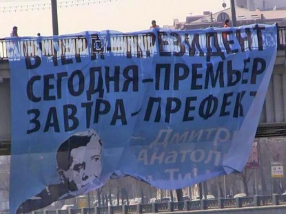 На Новоарбатском мосту в Москві вдень у вівторок був вивішений банер з написом "Вчора - президент! Сьогодні - прем'єр! Завтра - префект!".