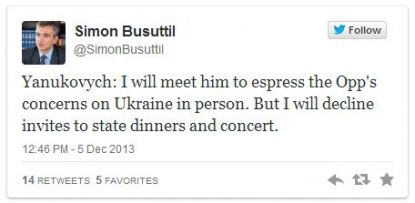 Президент Віктор Янукович здійснить державний візит на Мальту 9-10 грудня - pravda.com.ua Про це пише видання Maltatoday. "Прем'єр-міністр Йосип Мускат у вівторок провів телеконференцію з президентом Європейської комісії Жозе Мануелем Баррозу, щоб обговорити майбутній візит українського президента Віктора Януковича на Мальту на 9 і 10 грудня", - пише видання. У свою чергу лідер опозиції Мальти Симон Бусуттіл у своєму Твітері заявив, що не піде на концерт і офіційну вечерю, яка стане частиною програми держвізиту Януковича. ![]() Він уточнив, що при цьому піде на офіційні заходи за участю президента України, щоб висловити стурбованість опозиції про поточні події в Україні. FM-TV ВСЕ НОВОСТИ ПО-РУССКИ ТУТ другие новости