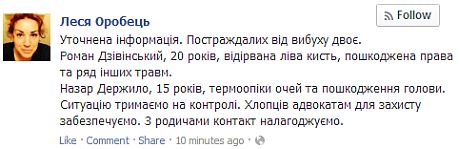 Помічниця Оробець повідомила телефоном, що більше подробиць буде згодом. У міліції поскаржилися на те, що учасники протестів не допустили слідчо-оперативну групу міліції на місце події. "Таким чином, наразі немає можливості об’єктивно розібратися у цій справі", - вважають в міліції. "До висновків нашої власної слідчої комісії ми не будемо запускати міліцію сюди, така постанова штабу", - прокоментував цю ситуацію Громадському ТБ активіст євромайдану Анатолій Ведмідь. Він також розповів, що у одного постраждалого, який є бійцем самооборони, відірвало кисть однієї руки і кілька пальців на іншій. Депутат від Батьківщини Олександр Бригинець у Facebook повідомив, що операція з ампутації частини кисті пораненого завершилася. "Операція завершилася. Хворий вже в палаті. Лікарі переконують, що ніяких слідчих дій щодо пацієнта сьогодні здійснювати не можна", - розповів він. другие новости