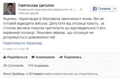 "Яценюк: переговори в Януковича закінчилися нічим. Він не готовий відводити війська. Депутати від опозиції кажуть, за столом звучала погроза притягнути до відповідальності всіх керівників опозиції. Янукович вважає, що опозиція не дотримується домовленостей", - написав він на своїй Facebook-сторінці.