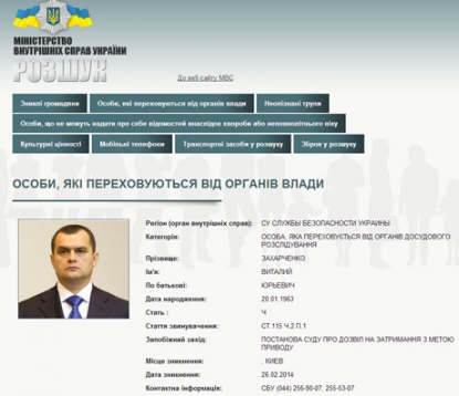 На сайті Міністерства внутрішніх справ з'явилось повідомлення про оголошення в розшук екс-міністра Віталія Захарченка.