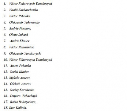 У списку, зокрема, екс-президент Віктор Янукович та його сини Олександр та Віктор, екс-голова МВС Віталій Захарченко, екс-очільник ГПУ Віктор Пшонка та його син Артем, екс-глава АП Андрій Клюєв, бізнесмен Сергій Курченко, екс-глава Кабміну Микола Азаров та його син Олексій та інші.Як відомо, 4 березня Литва заборонила в'їзд на свою територію колишньому екс-президенту Віктору Януковичу і ще 17-ти представникам колишньої влади, яких підозрюють у порушенні прав людини і застосуванні насильства.
