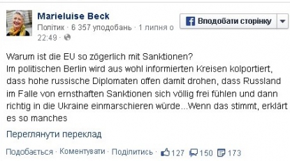"Чому ЄС не вирішує з санкціями? У політичному Берліні добре поінформовані джерела розповідають, що високі російські дипломати відкрито погрожують, що Росія, у разі серйозних санкцій, буде відчувати себе повністю вільною і піде прямо на Україну... Якщо це правда, це пояснює так багато", - переказала Бек інформацію, яка "ходить" політичними коридорами у Німеччині.