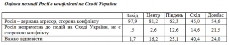Такими є результати соціологічного дослідження, проведеного Центром Разумкова з 6 по 12 березня 2015 року. Агресором Росію вважають 71,8% опитаних, непричетною до конфлікту її вважають лише 8,4%, вагалися з відповіддю – 19,8% опитаних.